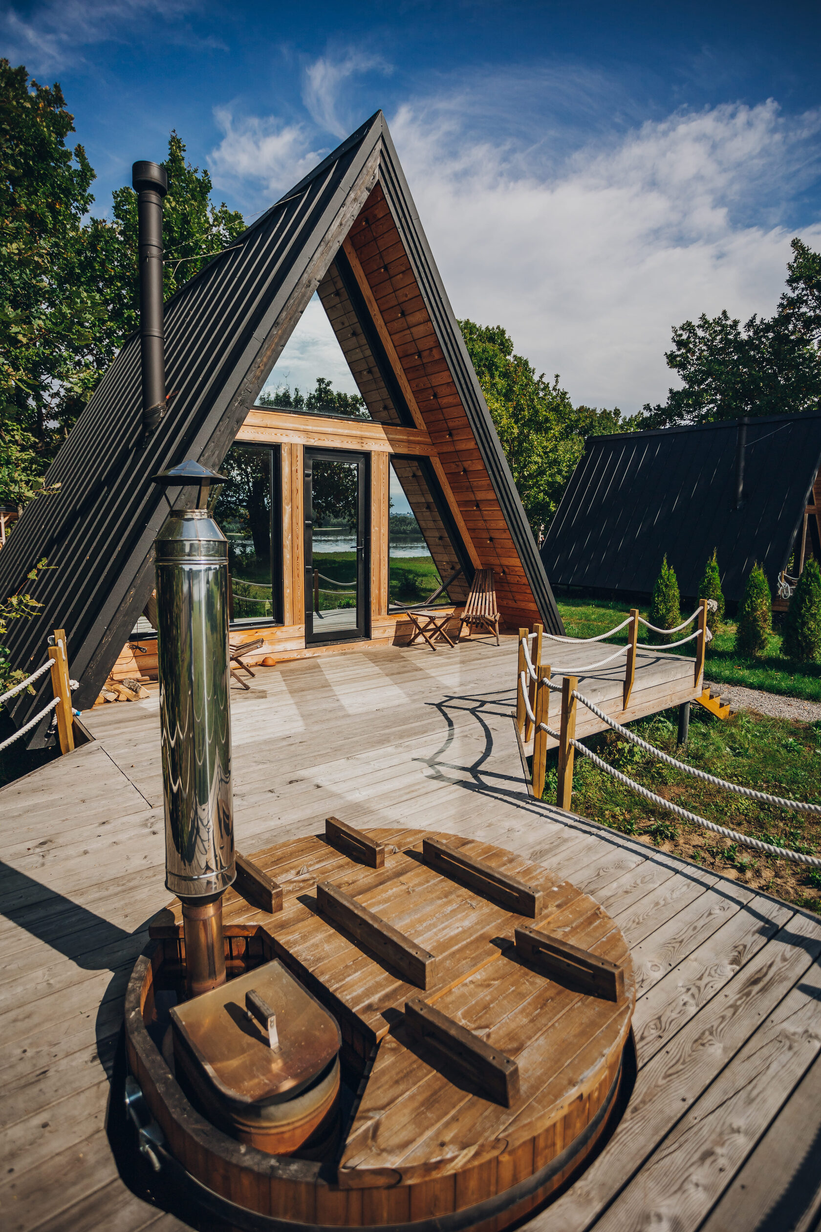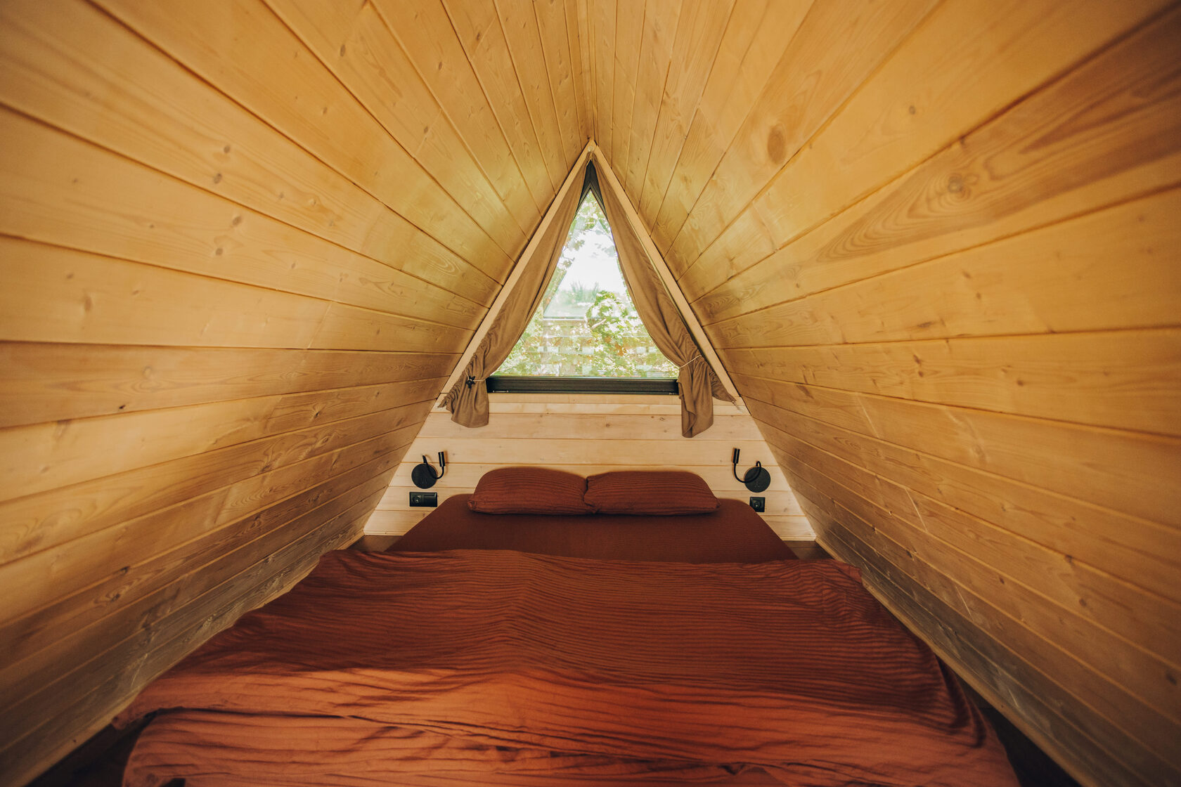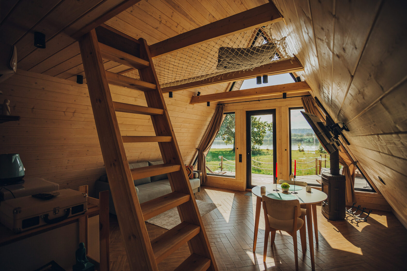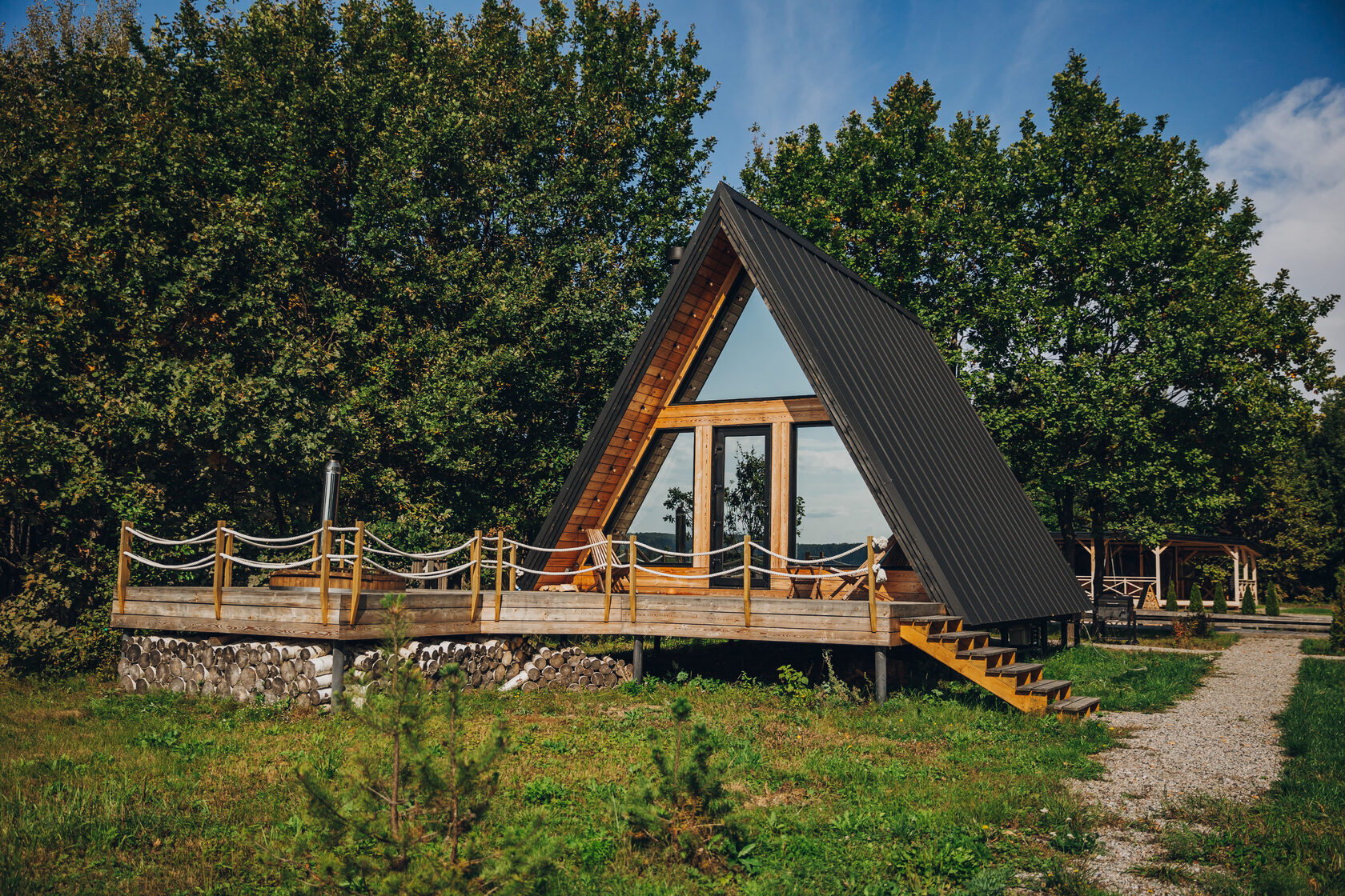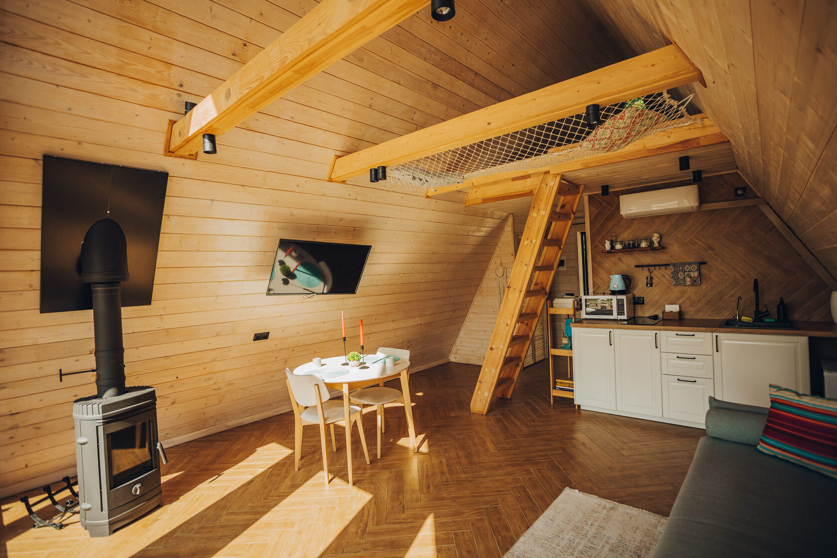 Домик №1 — дом с мансардным этажом в формате A-frame. В Вашем распоряжении гостевая зона, кухня, ванная комната и удобная спальня.