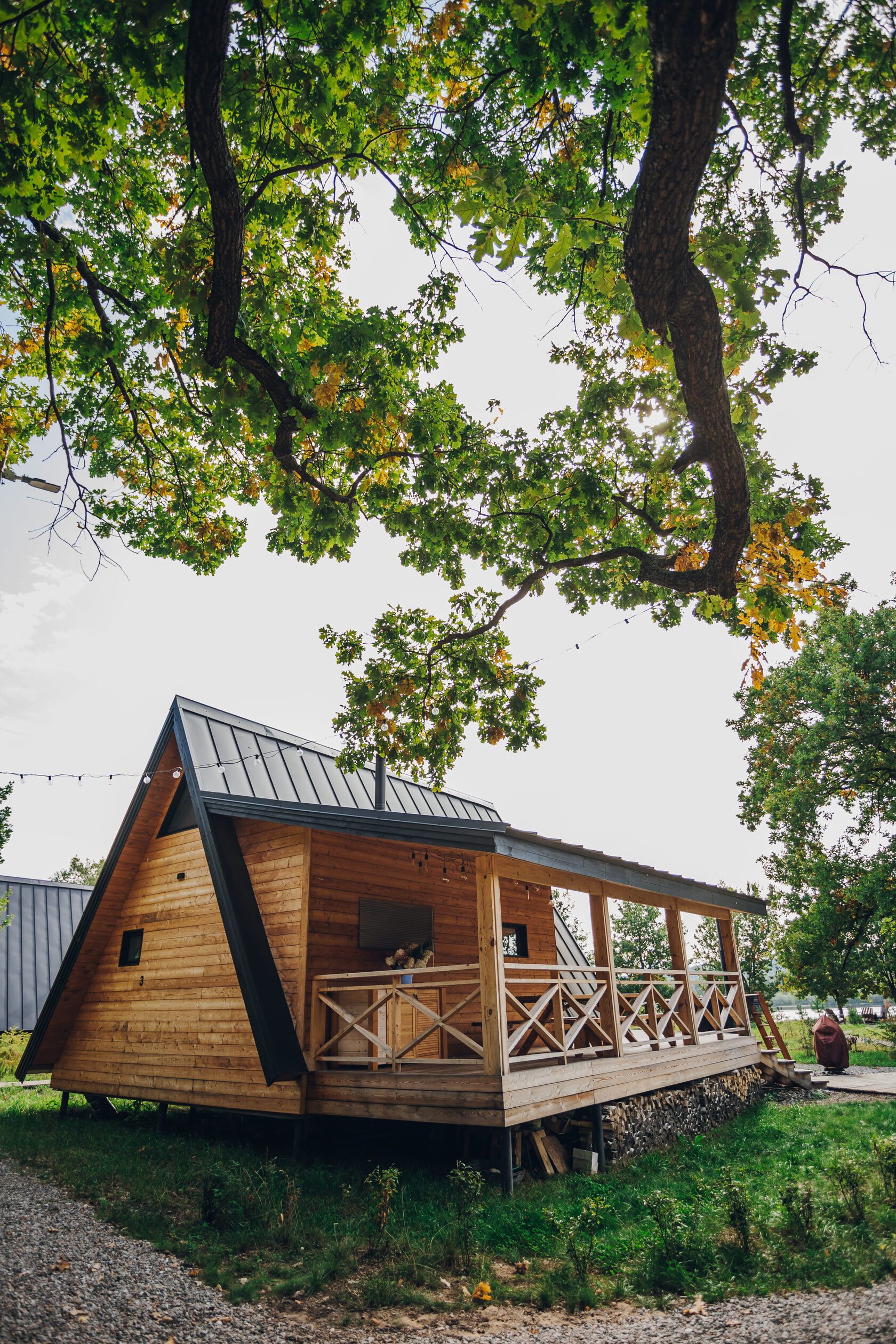 Домик №3 — дом с мансардным этажом в формате A-frame и встроенной баней. В Вашем распоряжении парная, гостевая зона, кухня, ванная комната и удобная спальня.