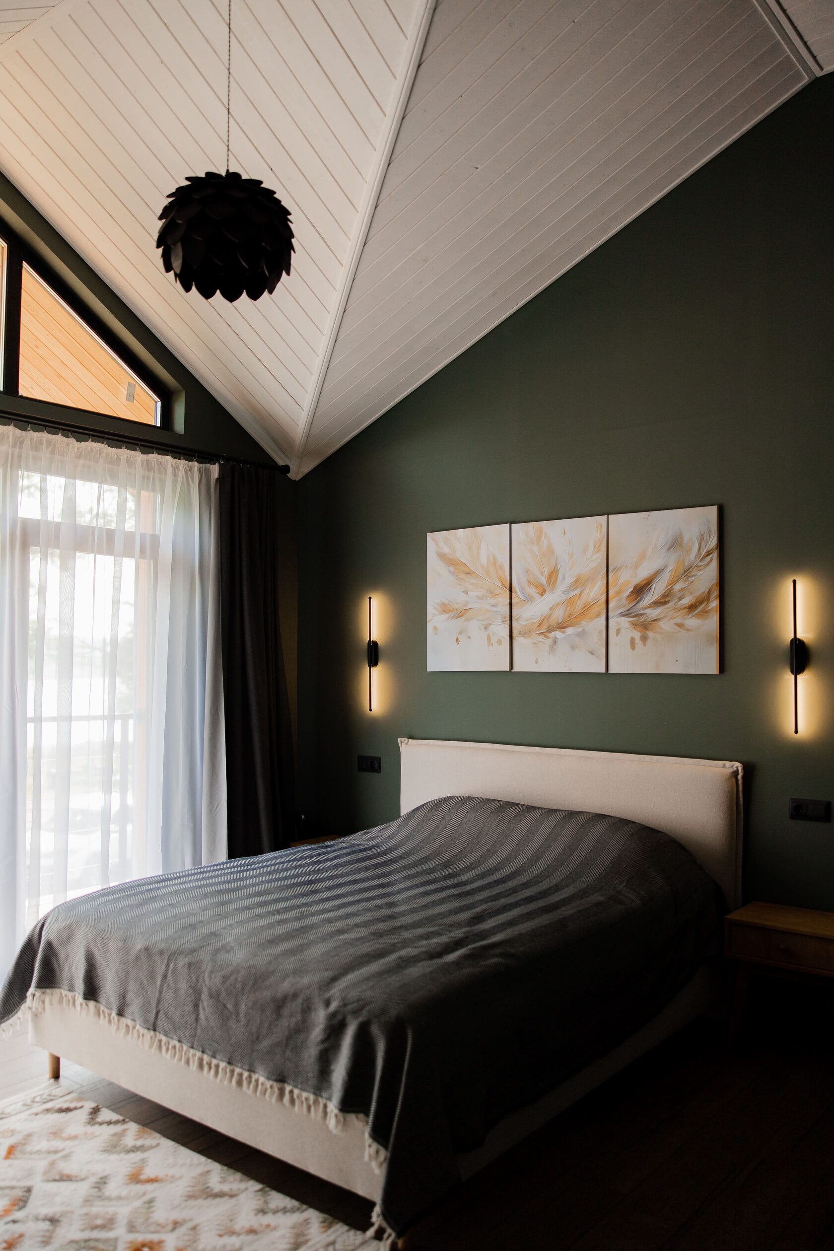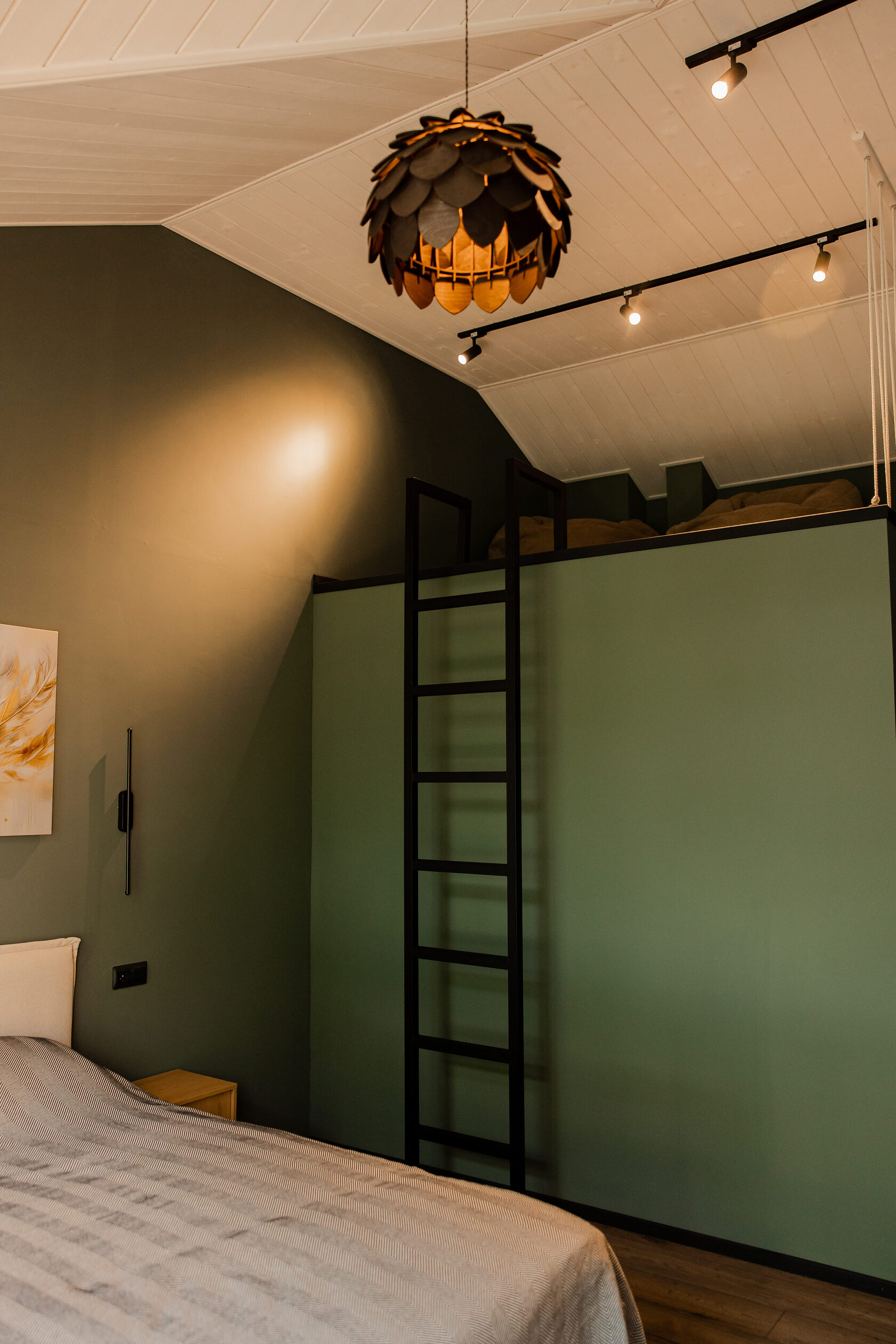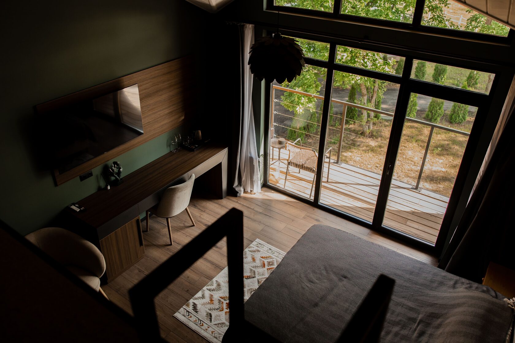 Номер в барнхаусе в спокойном зеленом оформлении — отличное решение для отдыха вдвоем или с маленьким ребенком. С панорамного окна открывается живописный вид на Волгу, которым Вы можете насладиться на террасе с чашкой кофе.